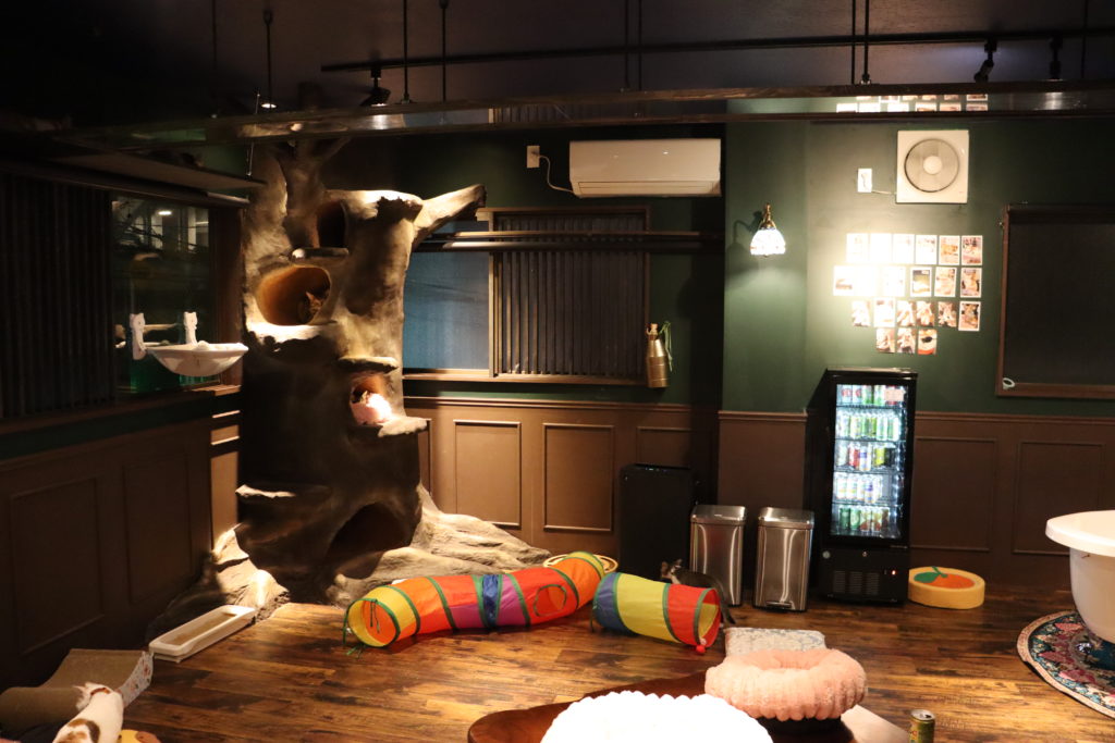 店内はブラウンを基調とした落ち着いたレトロな雰囲気で、大きな木のキャットタワーがシンボルとなっています。